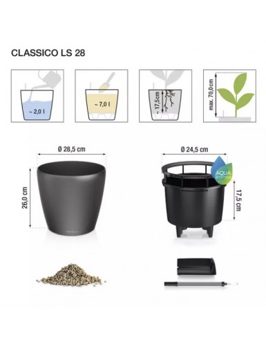Il CLASSICO Color LS riflette e diffonde la luce con la sua superficie satinata ed è ottimo per le piante sia all'interno che all'esterno. Il vaso è dotato di un inserto per piante intercambiabile con manico retrattile. Questo inserto costituisce un livello di separazione dal vaso, facilitando il trapianto e la pulizia del vaso stesso. Permette inoltre alle radici di crescere nel serbatoio dell'acqua e di essere potate secondo necessità.